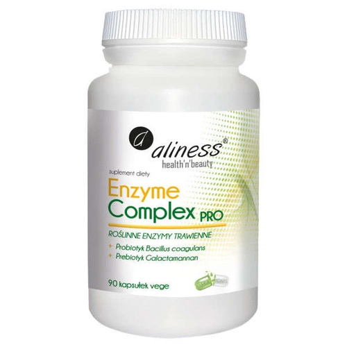 Enzyme Complex Pro od marki Aliness to kompleks bogaty w składniki wspierające układ trawienny, pokarmowy. Substancje naturalnego pochodzenia, otrzymane w procesie fermentacji wspierają trawienie m.in węglowodanów, białka i tłuszczy. Ponadto jako priobiotyk chroni jelita oraz żołądek przed nietolerowanymi, przyjmowanymi składnikami. Jako symbiotyk prebiotyku, probiotyku - składniki produktu wspomagają w prawidłowym funkcjonowaniu enzymów trawiennych. Produkt wolny od GMO, polecany szczególnie weganom i wegetarianom, ponieważ w produkcji suplementu wykorzystano wyłącznie składniki pochodzenia roślinnego.
