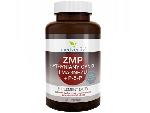 - Medverita ZMP Cytryniany Zn i Mg + P-5-P to suplement diety, który wspiera układ odpornościowy, poprawia metabolizm energetyczny i pomaga w utrzymaniu zdrowych kości, włosów oraz paznokci. Produkt jest idealny dla osób aktywnych fizycznie, intelektualnie.