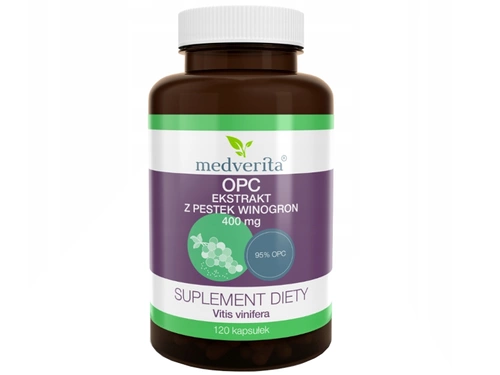 MEDVERITA OPC 95% ekstrakt z pestek winogron to suplement diety najwyższej jakości, zawierający skoncentrowany ekstrakt z pestek winogron. Dzięki zaawansowanym technikom produkcji, ekstrakt charakteryzuje się wysoką przyswajalnością. OPC, czyli oligomeryczne proantocyjanidyny, to cenne flawonoidy, które wspierają wiele procesów w organizmie. OPC wspiera prawidłowe funkcjonowanie naczyń krwionośnych i może pomóc w utrzymaniu zdrowego ciśnienia krwi. Silne właściwości przeciwutleniające OPC pomagają neutralizować wolne rodniki, chroniąc komórki przed uszkodzeniem. OPC wspomaga zdrowie oczu, poprawiając mikrokrążenie w naczyniach krwionośnych oczu. Suplement jest dostępny w formie kapsułek, co ułatwia jego codzienne stosowanie.