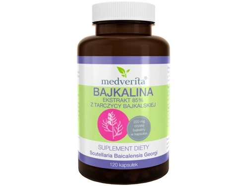 - MEDVERITA Bajkalina to suplement diety z ekstraktem z tarczycy bajkalskiej, bogaty w bajkalinę, wspierającą układ nerwowy. Naturalne składniki produktu wykazują działanie przeciwzapalne i poprawiają krążenie krwi, wpływając na lepsze samopoczucie.