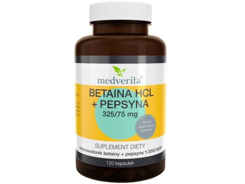 - MEDVERITA Betaina + Pepsyna to suplement diety wspomagający trawienie, łączący betainę HCL i pepsynę. Naturalne składniki w każdej kapsułce wspierają metabolizm i ułatwiają trawienie, szczególnie problematycznych pokarmów.