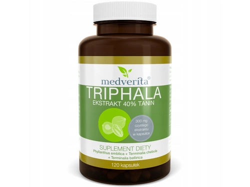 - MEDVERITA Triphala 300 mg to naturalny suplement diety, który wspiera pracę układu trawiennego i pomaga przy zaparciach. Składniki roślinne zawarte w produkcie, poprawiają metabolizm i ułatwiają przyswajanie składników odżywczych.