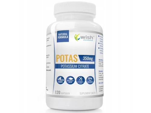 WISH POTAS to suplement diety zawierający aż 350 mg cytrynianu potasu w każdej kapsułce. Produkt został stworzony w oparciu o nowoczesną technologię. Odpowiedni poziom potasu w organizmie zmniejsza ryzyko odwodnienia, jest to szczególnie ważne w przypadku sportowców. Potas odgrywa ważną rolę w pracy układu nerwowego. Dodatkowo niedobór potasu może być przyczyną złej pracy serca i układu krwionośnego.