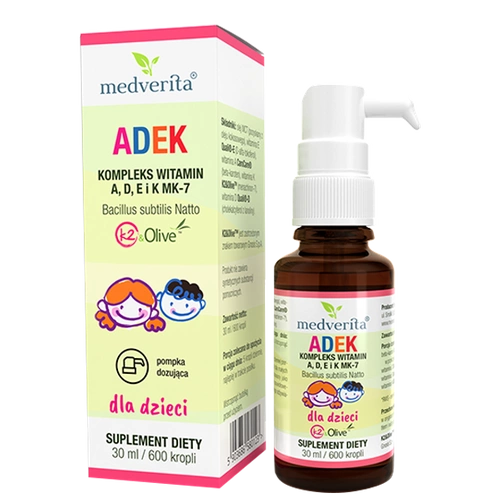 - Witaminy ADEK dla dzieci od MEDVERITA to kompleks witamin A, D3, E i K2 MK-7 w łatwo przyswajalnej formie kropli. Produkt wspiera zdrowy rozwój kości, odporność i prawidłowe widzenie dziecka, dzięki naturalnym źródłom witamin i precyzyjnemu dozowaniu.