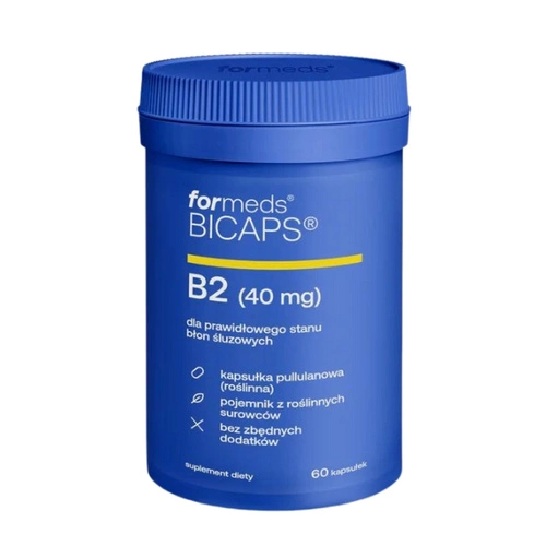 - FORMEDS BICAPS Witamina B2 Ryboflawina 40mg 60 kaps to suplement dostarczający optymalną dawkę ryboflawiny, niezbędnej dla prawidłowego funkcjonowania układu nerwowego, zmniejszenia zmęczenia oraz wsparcia metabolizmu energetycznego.