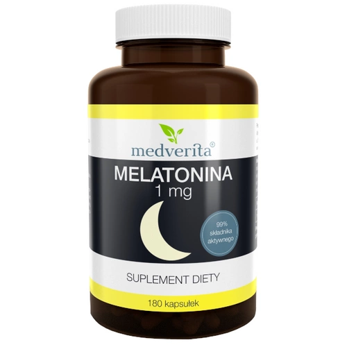 - MEDVERITA Melatonina to suplement diety, który zawiera 1 mg melatoniny w każdej kapsułce, pomagając regulować cykl snu i poprawiać jego jakość. Działa antyoksydacyjnie, wspierając ochronę komórek i przyczyniając się do lepszego samopoczucia.
