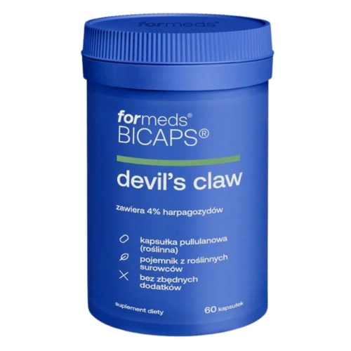 - FORMEDS BICAPS Devils Claw to suplement diety, który dzięki wysokiej zawartości harpagozydów z hakorośli rozesłanej (czarciego pazura), aktywnie wspiera prawidłowe trawienie. Jest to naturalne wsparcie dla Twojego układu pokarmowego w wygodnej formie.
