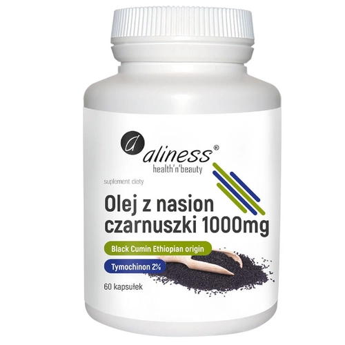 Suplement diety od ALINESS zawiera olej z nasion czarnuszki. Nasiona z Etiopii zapewniają podwyższoną zawartość tymochinonu (2%) w opisywanym produkcie. Nasiona czarnuszki zawierają kwas oleinowy, linolowy oraz palmitynowy. Suplement doskonale wspomaga regulowanie poziomu glukozy we krwi.