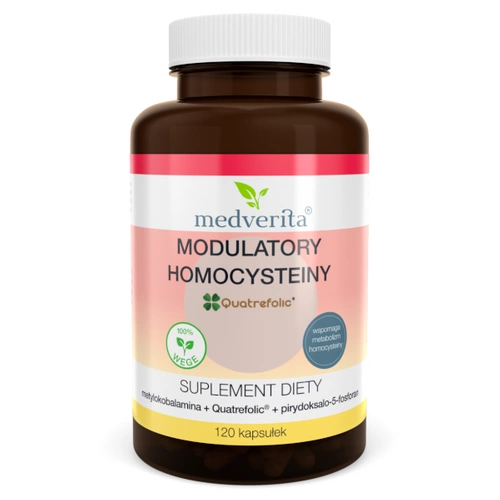 - MEDVERITA Modulatory Homocysteiny to suplement diety, który kompleksowo wspiera zdrowie układu sercowo-naczyniowego poprzez utrzymanie prawidłowego poziomu homocysteiny. Preparat skutecznie reguluje metabolizm, zapewniając optymalne funkcjonowanie.