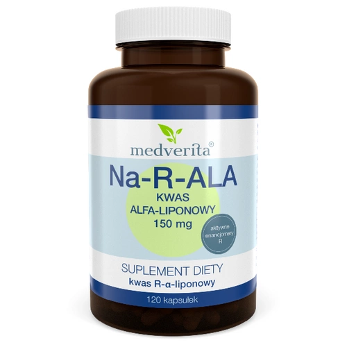 - MEDVERITA ALA 150mg to suplement diety, który dostarcza naturalny enancjomer R-ALA w formie sodowej, wspierając ochronę antyoksydacyjną i funkcje kognitywne. Ten produkt, dzięki swoim właściwościom, wzmacnia organizm i poprawia koncentrację, samopoczucie
