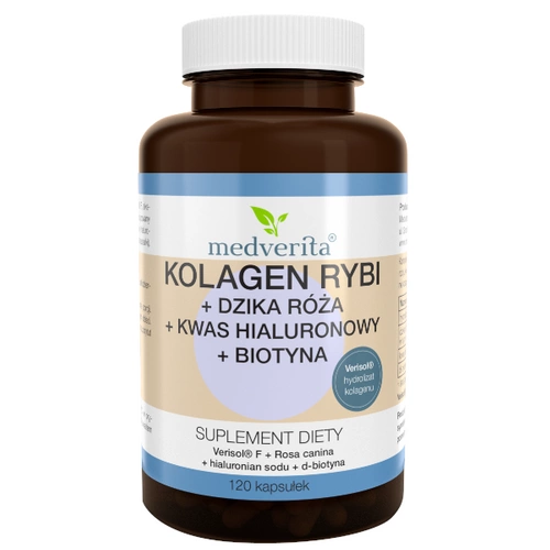 - Suplement diety marki MEDVERITA posiada kompleks kolagenu rybiego, ekstrakt z dzikiej róży, kwas hialuronowy i biotyne. Wpływa na układ nerwowy, zdrowie włosów, skóry i paznokci.