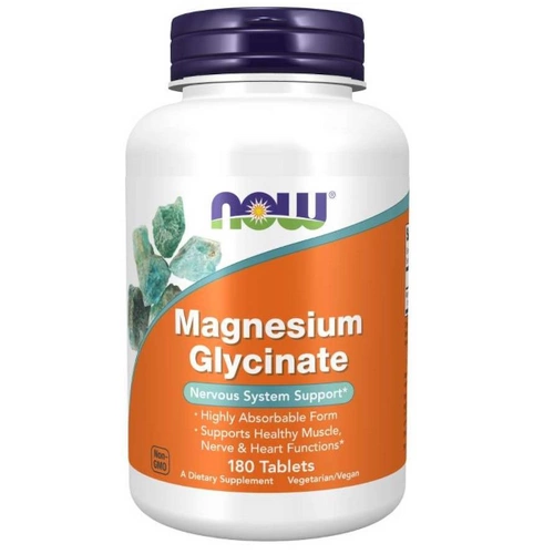 Suplement diety od marki NOW FOODS, który w swoim składzie posiada glicynian magnezu. Jest to magnez związany z aminokwasem glicyną, co pomaga uzyskać jego lepszą wchłanialność w przewodzie pokarmowym. Magnez to jeden z najważniejszych minerałów w organizmie człowieka, odpowiadający za wiele funkcji. Bierze udział w przekazie impulsów nerwowych, wzmacniając mózg, pamięć i koncentrację. Zmniejsza aktywność komórek nerwowych, co pomaga uzyskać wewnętrzny spokój, podczas dużej nerwowości. Wpływa na prawidłowe funkcjonowanie układu mięśniowo-kostnego, niwelując skurcze nocne i mineralizując kości. Uczestniczy w produkcji tłuszczów i białka, a także w procesie metabolizmu glukozy. Zmniejsza napięcie przedmiesiączkowe i ból menstruacyjny u kobiet. Dodatkowo dba o prawidłowy poziom glukozy we krwi.