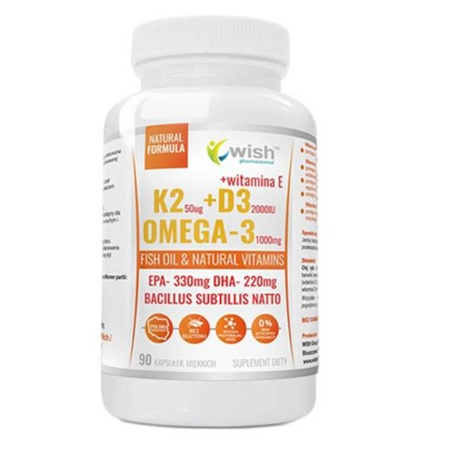 Suplement diety od marki WISH to źródło kwasów tłuszczowych wielonienasyconych omega 3. Dodatkowo został wzbogacony o witaminę D3 i K2. Kwasy Omega 3 pozytywnie wpływają na pracę układu sercowo-naczyniowego. Zmniejszają ilość złego cholesterolu, stabilizują ciśnienie krwi i poprawiają krążenie. Witamina K2 zawarta w produkcie ma dobrą formę przyswajalności w organizmie człowieka. Wpływa pozytywnie na krzepnięcie krwi, sprzyja leczeniu ran i chroni przed krwotokami. Oddziałuje pozytywnie na lepsze wchłanianie witaminy D3, która dba o układ kostno-szkieletowy, wzmacnia kości, zapobiega powstawaniu bakterii próchnicy na zębach.