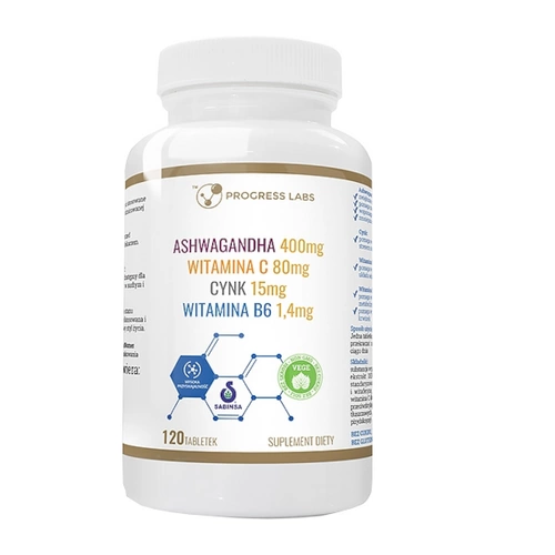 Składniki: Substancja wypełniająca: sorbitol, ashwaganda ekstrakt DER 8:1 (withania somnifera), standaryzowana na witanolidy, alkaloidy i witaferynę A; cynk (glukonian cynku), witamina C (kwas L-askorbinowy), substancja przeciwzbrylająca: sole magnezowe kwasów tłuszczowych, witaminia B6 (chlorowodorek pirydoksyny).