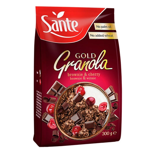 Granola od marki SANTE w swoim składzie posiada tylko wyselekcjonowane składniki oraz minerały takie jak: błonnik, fosfor, magnez, żelazo, cynk, miedź i mangan. Dodatkowo wzbogacona została o tiaminę. Idealnie sprawdzi się jako przekąska na śniadanie dla osób ceniących sobie zdrowe przekąski. Smakowita i chrupiąca porcja granoli o smaku brownie i wiśni urozmaici Twój codzienny posiłek i uzupełni organizm w niezbędne minerały. Nie posiada w składzie oleju palmowego, pszenicy i syropu glukozowo- fruktozowego. SANTE Gold Granola dostarcza dużą dawkę węglowodanów, tłuszczów i białka, dodając energii do działania.