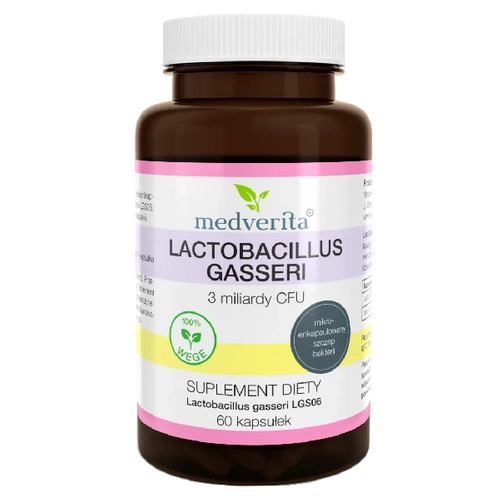 - MEDVERITA Lactobacillus Gasseri to suplement diety zawierający 3 miliardy CFU dobroczynnych bakterii kwasu mlekowego, które wspierają zdrowie układu pokarmowego i pomagają odbudować mikroflorę jelitową. Dodatek błonnika akacjowego wspomaga trawienie.
