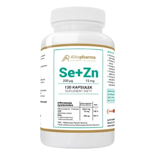 Suplement diety od marki ALTO PHARMA w swoim składzie zawiera cynk oraz selen w formie kapsułek łatwych do połknięcia. Chroni komórki organizmu przed negatywnym wpływem stresu oksydacyjnego oraz wzmacnia układ odpornościowy, zmniejszając ryzyko wystąpienia infekcji. Poprawia stan włosów, powodując, że mniej wypadają i są mocniejsze. Wzmacnia paznokcie, zmniejszając ich łamliwość oraz przyczynia się do ogólnej poprawy skóry. Pomaga w prawidłowym funkcjonowaniu tarczycy, która odpowiedzialna jest za wytwarzanie dwóch hormonów zawierających jod. Decydują o prawidłowym funkcjonowaniu wszystkich komórek organizmu, które odpowiedzialne są za metabolizm węglowodanów, enzymów, białek. Cynk i Selen mają bardzo ważną rolę w organizmie człowieka: zwiększają ilość przeciwciał i białych krwinek, oraz chronią komórki układu immunologicznego przed zaburzeniami.