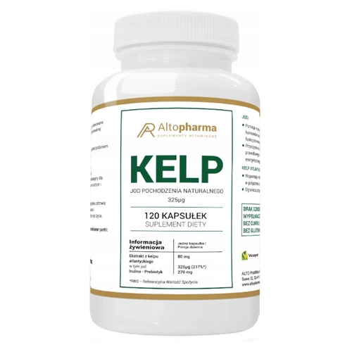 Suplement diety firmy ALTO PHARMA uzupełnia niedobory jodu w organizmie człowieka. Wpływa korzystnie na prawidłowe funkcjonowanie tarczycy. Kelp, czyli naturalny ekstrakt z alg morskich wspomaga osoby będące na diecie redukcyjnej - bardzo dobry wybór przy zwiększonym wysiłku fizycznym oraz psychicznym. Zadbaj o swoje zdrowie!