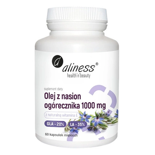 Suplement diety od marki ALINESS z olejem z nasion ogórecznika oraz z dodatkiem witaminy E. Produkt jest bogatym źródłem kwasów omega i kwasu gamma-linolenowego. Ogórecznik ma działanie przeciwzapalne oraz przeciwgorączkowe. Zmniejsza ryzyko rozwoju chorób płuc, gardła, oraz zapobiega astmie i alergii. Pomocny staję się podczas dolegliwości dróg oddechowych, mając działanie wykrztuśne. Może łagodzić również kaszel i chrypkę. Preparat zawiera w składzie witaminę E, która wykazuje działanie antyoksydacyjne, ponieważ usuwa toksyny i szkodliwe substancje, chroniąc tym samym cały organizm. Kwas linolenowy i kwasy omega wpływają na obniżenie poziomu ''złego'' cholesterolu i zapobiegają odkładaniu się jego złogów w naczyniach krwionośnych. Regularne suplementowanie oleju z nasion ogórecznika oddziałuje pozytywnie na skórę, włosy i paznokcie. Polecany jest szczególnie osobom, które mają problem z łamliwością paznokci i wypadaniem oraz osłabieniem włosów. Wpływa na prawidłową kondycję naskórka, jego elastyczność i poziom nawilżenia.