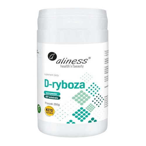 ALINESS D-ryboza to suplement diety w formie proszku do rozpuszczania. Jego skład bazuje na rybozie, która jest cukrem prostym (monosacharydem), a jej podstawową właściwością jest produkcja i dostarczanie energii do komórek w organizmie tzw. ATP- adenozyno-5’-trifosforanu. Stanowi ona bowiem paliwo dla mitochondriów w komórkach i odpowiada za dostarczenie energii dla całego organizmu. Bardzo często wykorzystywana jest przez aktywnych sportowców, ponieważ podczas wysiłku fizycznego zużywa się dużo energii ATP, a regularna suplementacja d-rybozy może temu zapobiec, co będzie miało bezpośredni wpływ na wzrost wydolności i wytrzymałości.