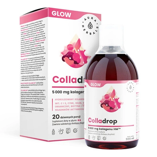 AURA HERBALS Colladrop Glow to wysokiej jakości suplement diety, którego skład bazuje na hydrolizowanym kolagenie typu I i III. Oprócz tego produkt został wzbogacony o cenne witaminy i minerały takie jak: witamina C, E, biotyna, cynk, kwas hialuronowy, witaminy z grupy B, koenzym Q10 i wiele innych. Ma wygodną formę suplementacji w postaci płynu oraz bezpieczny skład, bez dodatku konserwantów i ulepszaczy. Kolagen hydrolizowany pozyskiwany jest ze skór dzikich ryb, w sposób bardzo przyjazny dla środowiska i wchodzi w skład ludzkiej skóry. Wyróżnia się bardzo wysoką przyswajalnością i bardzo dobrym działaniem. Wpływa na utrzymanie kondycji skóry, sprawiając, że jest sprężysta, wygładzona i nawilżona, a także pomaga zachować dobrze funkcjonujące kości i stawy. Kolagen stanowi 70% struktury stawów, dlatego jest tak istotny, aby aparat ruchu był zdrowy i elastyczny.