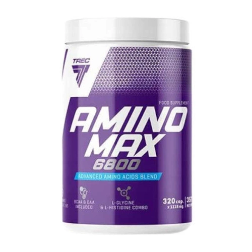 TREC Amino Max 6800 to kompleks aminokwasów endo- i egzogennych, wzmocnionych tauryną, witaminami i L-glutaminą. Aminokwasy w produkcie pozyskiwane są z hydrolizatu izolatu serwatki, dzięki czemu wyróżniają się wysoką przyswajalnością. Preparat występuję w formie kapsułek, które ułatwiają codzienną suplementacją i umożliwiają precyzyjne odmierzenie porcji. Amino Max w szybki i bezpieczny sposób uzupełnia niedobór aminokwasów po intensywnym treningu oraz z powodu zbyt małej ilości spożytych białek w swojej codziennej diecie. Przyczynia się do zwiększenia siły i wytrzymałości organizmu, a po wykonanym treningu przyśpiesza proces regeneracji.