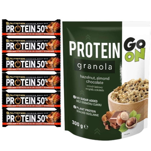 - GO ON Protein Granola 300 g - to proteinowa granola, której skład opiera się na płatkach zbożowych oraz na izolacie białka serwatkowego. Dostarcza wysokiej jakości składniki odżywcze, w tym witaminy i minerały, które wpływają na prawidłowe funkcjonowanie organizmu. Produkt pozwala stworzyć odżywcze śniadanie, które syci na długi czas i zmniejsza uczucie głodu.