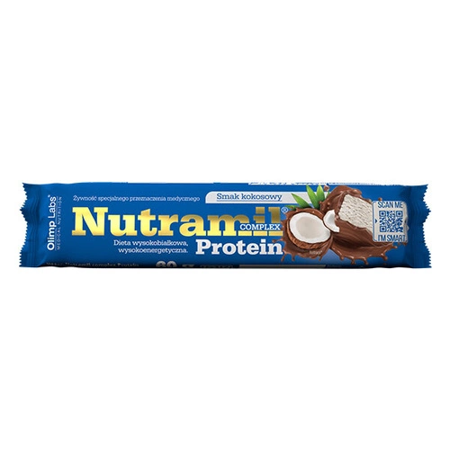 OLIMP Nutramil Complex Protein to wysokoenergetyczny oraz wysokobiałkowy baton o smaku kokosowym. Ta znakomita przekąska sprawdzi się osobom, które chcą uzupełnić swoją codzienną dietę w białko lub jeśli ich zapotrzebowanie na ten ważny składnik jest większe. Baton Nutramil należy do żywności specjalnego przeznaczenia medycznego, dlatego też stanowi idealny dodatek do diety osób z niedożywieniem lub z ryzykiem jego wystąpieniem. Ta odżywcza i zarazem pyszna w smaku przekąska w polewie z mlecznej czekolady zawiera wysoką ilość białka, wzbogaconą L-leucyną, a także aminokwasem egzogennym, którego organizm sam nie jest w stanie wytworzyć.