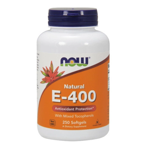 NOW FOODS E-400 250 kaps to suplement diety, który zawiera 268 mg witaminy E w jednej kapsułce. Witamina E to cenny składnik, który wspiera funkcjonowanie układu krwionośnego. Między innymi chroni przed zakrzepami, miażdżycą, a także redukuje poziom cholesterolu. Co więcej, witamina E to silny antyoksydant, który chroni komórki i tkanki organizmu przed negatywnym działaniem stresu antyoksydacyjnego oraz opóźnia procesy starzenia.