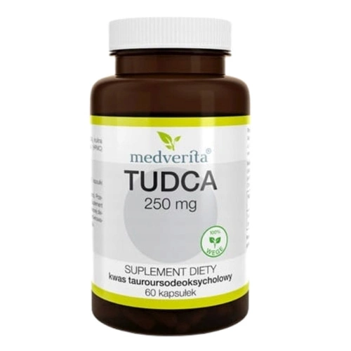 MEDVERITA Tudca to suplement diety zawierający w składzie kwas tauroursodeoksycholowy, czyli sól żółciową. Kwasy żółciowe, które docierają do jelit zamieniane są tam na UDCA wiążąc się z tauryną, co na końcu tworzy TUDCA. Dużą ciekawostką jest fakt, iż TUDCA była produkowana w ciele niedźwiedzi i od setek lat wykorzystywana w medycynie chińskiej jako wsparcie wątroby. Preparat ten ma wiele pozytywnych wpływów na organizm człowieka: z jednej strony jest substancją wspierającą układ nerwowy, a z drugiej chroni komórki wątroby i łagodzi stres oksydacyjny. TUDCA wspiera regenerację wątroby, a także ma zdolność usuwania trujących substancji, chroniąc wątrobę przed zatruciem, np. po spożyciu alkoholu.