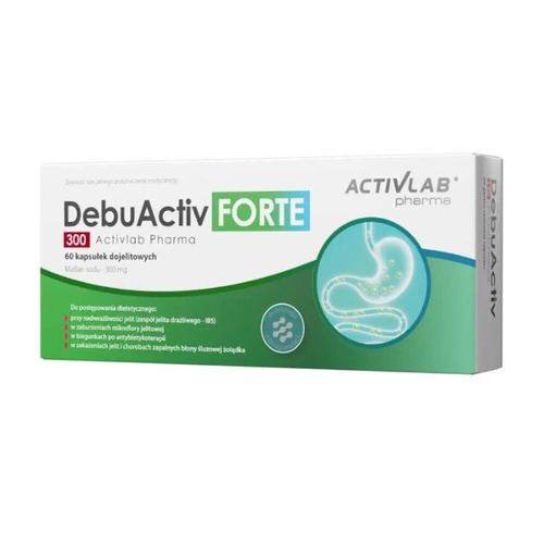 ACTIVLAB PHARMA DebuActiv Forte to suplement diety w formie kapsułek dojelitowych. Jego skład bazuje na maślanie sodu, który występuje w postaci mikrogranulatu, dzięki czemu proces uwalniania maślanu sodu odbywa się na całej długości jelita cienkiego i grubego. Kapsułki dojelitowe wyróżniają się odpornością na kwaśne środowisko żołądka i uwalniają substancje czynne dopiero w jelicie cienkim. Produkt jest zalecany podczas postępowania dietetycznego, w trakcie występowania zaburzeń mikroflory jelitowej. Maślan sodu wykazuje działanie ochronne i regenerujące na nabłonek jelita. Usprawnia proces trawienia i zapobiega zaparciom oraz wzdęciom. Może poprawić komfort życia – poprzez zmniejszenie dolegliwości bólowych ze strony układu pokarmowego.