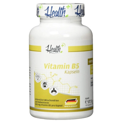 HEALTH+ Vitamin B5 to suplement diety w formie kapsułek zawierający w składzie kwas pantotenowy. Jest to niezbędny składnik aktywny potrzebny do ochrony komórek i tkanek organizmu przed wolnymi rodnikami. Wspiera pracę układu nerwowego, poprawiając pracę mózgu, w tym pamięć i koncentrację. Zmniejsza uczucie zmęczenia i znużenia, dodając niezbędnej energii do działania. Witamina B5 wykazuje także właściwości przyspieszające gojenie ran, przeciwdziała powstawaniu zmarszczek i spowalnia starzenie się. Kwas pantotenowy wspomaga również pigmentację włosów, tym samym zapobiegając siwieniu kosmyków.