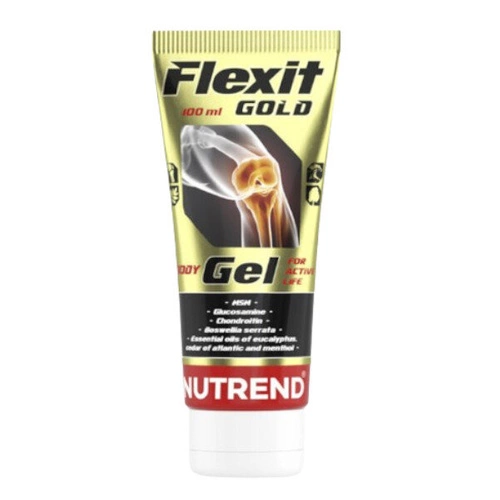 NUTREND Flexit Gold Gel. Jest to żel do stosowania miejscowego o miętowym zapachu, który ma działanie rozgrzewające. Jego formuła wnika w głąb skóry i dba o dostarczenie do stawów niezbędnych składników aktywnych. Zawiera chondroitynę odpowiedzialną za zmniejszenie tarcia i odbudowę chrząstki.