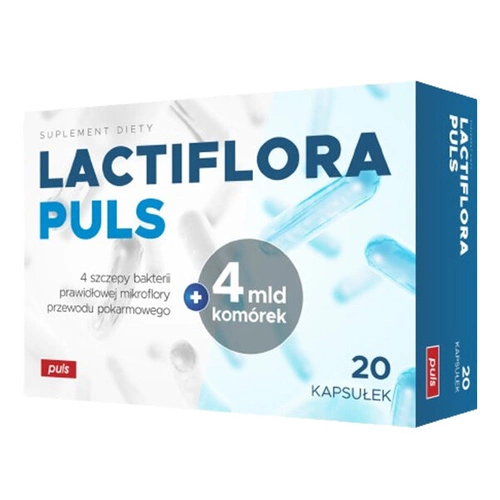 Lactiflora od marki PULS to suplement diety w formie kapsułek zawierający w składzie mieszankę 4 szczepów bakterii probiotycznych. Występują one w mikroflorze przewodu pokarmowego i odpowiadają za prawidłowe funkcjonowanie układu pokarmowego. Jedna kapsuła zawiera 4 miliardy komórek: Lactobacillus acidophilus, Bifidobacterium bifidum, Lactobacillus rhamnosus, Streptococcus thermophilus. Preparat jest zalecany podczas występowania takich dolegliwości jak: biegunki, wzdęcia, zaparcia, niestrawność.