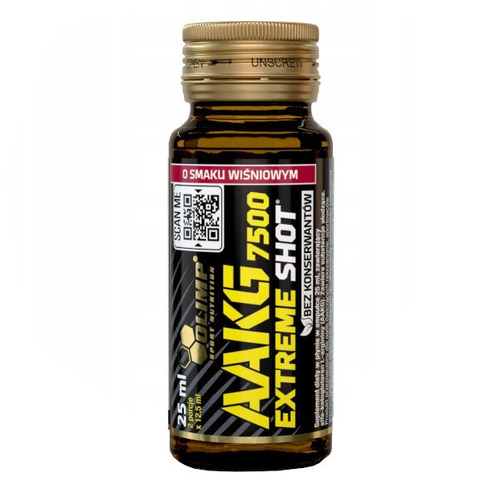 • OLIMP AAKG 7500 Extreme Shot to suplement diety w formie szklanej ampułki, zawierający wysoką dawkę L-argininy. Dzięki temu produktowi, możliwe jest zwiększenie pompy mięśniowej podczas treningów oraz poprawa wydolności, wytrzymałości i siły.