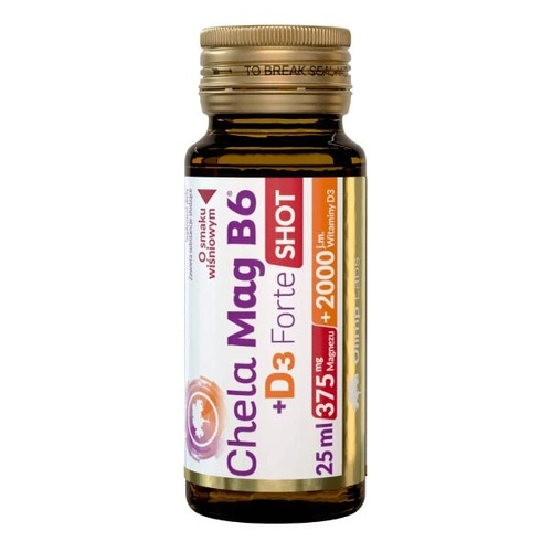 • OLIMP Chela-Mag B6 + D3 Forte Shot jest to shot w postaci płynu w ekologicznej ampułce o znakomitej przyswajalności magnezu z witaminami B6 oraz D3. Idealnie sprawdzi się dla osób chcących zadbać o swoje zdrowie, witalność jak i dobre samopoczucie.