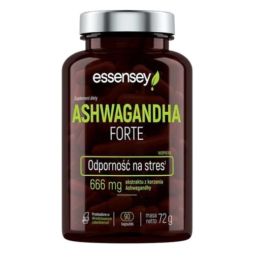 - ESSENSEY Ashwagandha Forte 90 to suplement diety zawierający ekstrakt z korzenia Ashwagandha, który wzmacnia odporność na stres i pomaga utrzymać optymalną równowagę emocjonalną.