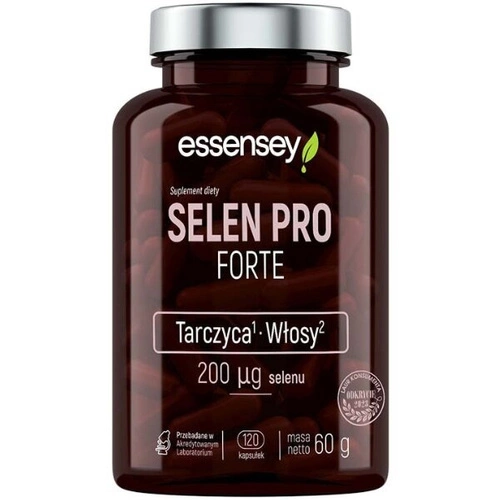 - Suplement diety ESSENSEY Selen Pro Forte 200 μg jest w formie kapsułek. Skierowany do osób borykających się nieprawidłową pracą tarczycy oraz słabą kondycją włosów i paznokci.
