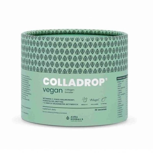 Suplement diety marki Aura Herbals to świetna alternatywa suplementów kolagenowych, która dostosowana jest dla wegan. Kolagen pozyskiwany z niemodyfikowanej genetycznie kukurydzy. Dzięki wyizolowanym aminokwasom, organizm lepiej przyswaja produkt. Oprócz kolagenu w saszetce znajdziemy aminokwasy, kwas hialuronowy, witaminy z grupy B czy też koenzym Q10. Kolagen jest istotny dla elastyczności i nawilżenia skóry. Suplementacja kolagenem może pomóc w zachowaniu młodego wyglądu skóry. Kolagen jest również ważnym składnikiem chrząstki, kości i stawów. Pomaga w zachowaniu ich elastyczności i wytrzymałości, co jest szczególnie ważne dla osób starszych oraz aktywnych fizycznie, które mogą odczuwać obciążenie stawów.
