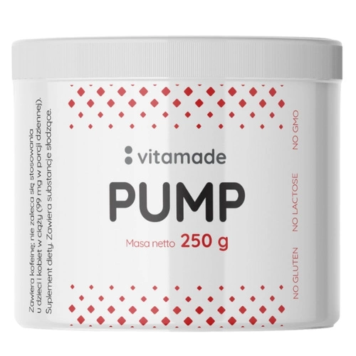 - VITAMADE PUMP 250 g to suplement diety dla osób aktywnych fizycznie, wspierający wydolność i regenerację dzięki składnikom takim jak jabłczan cytruliny, beta-alanina, żeń-szeń koreański, kofeina bezwodna i ekstrakt z pieprzu czarnego