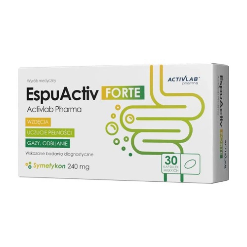Skład wyrobu: Wyrób medyczny EspuActiv FORTE Activlab Pharma zawiera 240 mg symetykonu w kapsułce miękkiej żelatynowej.