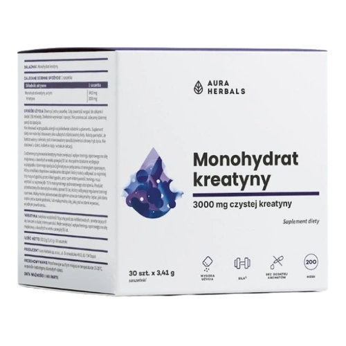 - AURA HERBALS Kreatyna Monohydrat to suplement diety w saszetkach, dostarczający 3000 mg kreatyny na porcję, wspomagający wydolność fizyczną, siłę mięśniową oraz regenerację po treningu.