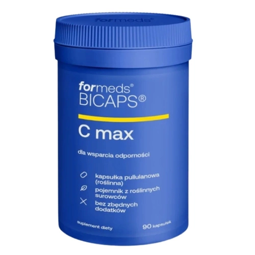 - FORMEDS Bicaps C Max to suplement diety dla dorosłych, który dostarcza wysoką dawkę witaminy C, wspiera odporność, zdrowie skóry, kości i stawów oraz zawiera dodatkowe składniki, takie jak witamina D3, cynk i bioflawonoidy roślinne.