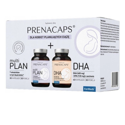FORMEDS PRENACAPS MultiPlan + DHA to starannie opracowany suplement diety dla kobiet planujących ciążę, dostarczający niezbędnych składników odżywczych. Formuła zawiera kompleks witamin i minerałów wspierających zdrowie przyszłej mamy oraz prawidłowy rozwój dziecka.