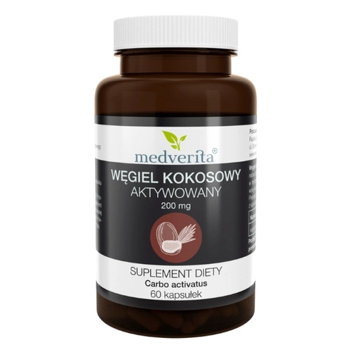 - MEDVERITA Węgiel Kokosowy Aktywowany 200 mg to naturalny suplement z łupin orzecha kokosowego, wspierający układ trawienny poprzez adsorpcję toksyn, gazów i niepożądanych substancji.