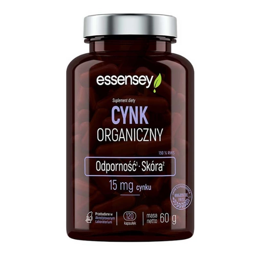 - Suplement diety ESSENSEY Cynk Organiczny wspiera układ odpornościowy, zdrowie skóry, paznokci oraz włosów. Regularne spożycie cynku chroni komórki przed stresem oksydacyjnym i wspomaga funkcje poznawcze oraz zdrowie kości.