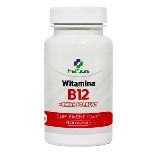 - MedFuture Witamina B12 + Kwas Foliowy to suplement diety wspierający produkcję czerwonych krwinek, funkcjonowanie układu nerwowego i metabolizm energetyczny, szczególnie polecany kobietom w ciąży dla prawidłowego rozwoju dziecka.