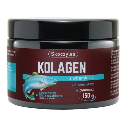 - SKOCZYLAS Kolagen z Dorsz Atlantyckiego + Witamina C 150 g to wysokiej jakości suplement łączący hydrolizowany kolagen morski z dzikiego dorsza z witaminą C, wspierający zdrowie skóry, stawów, kości i naczyń krwionośnych.