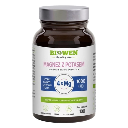 - Magnez z Potasem Biowen to suplement diety zawierający cztery łatwo przyswajalne formy magnezu oraz cytrynian potasu, wspierające układ nerwowy, mięśnie, serce i równowagę elektrolitową. Polecany zwłaszcza w okresie stresu, zmęczenia.