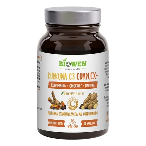 - BIOWEN Kurkuma C3 Complex+ to nowoczesny suplement łączący trzy formy kurkuminy z imbirem i piperyną. Dzięki ekstraktowi Curcumin C3 Complex® o wysokiej przyswajalności, wspiera trawienie, odporność, stawy, układ nerwowy i skórę.